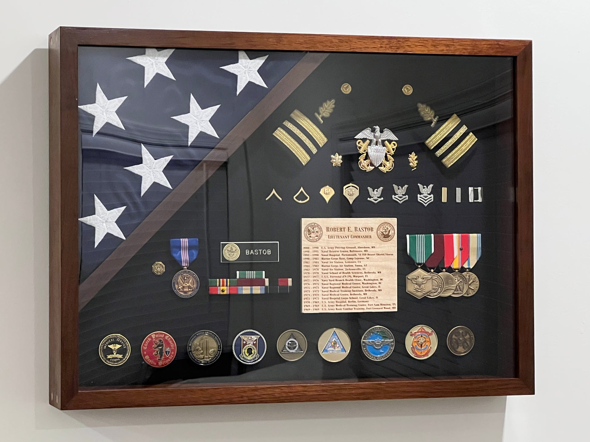 Hand built hardwood military shadow box with one triangle flag compartment in the top left corner. Constructed of hardwood lumber. removable back panel with machine screw hardware. features 1/2 inch cork board on the backer for easy installation of memorabilia. This box is special order. Purchaser must pick wood and any accessories for this build.